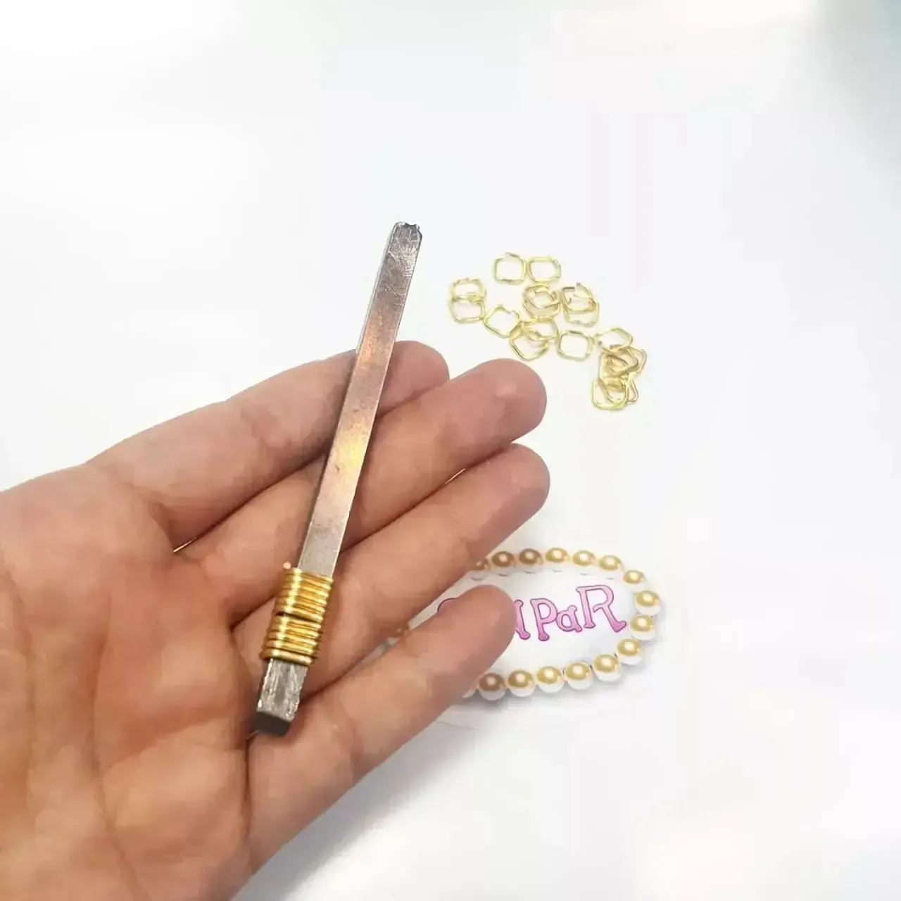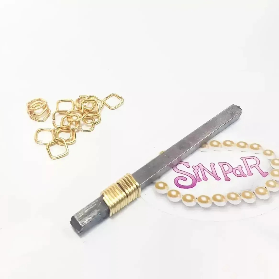 Mandril de hierro artesanal de 8,5 cm de largo. Se utiliza para girar almabre sobre éste, luego debe golpearse cad alado Gon un martillo de goma o de cuero de búfalo para definir mejor la forma cuadrada de las argollas.