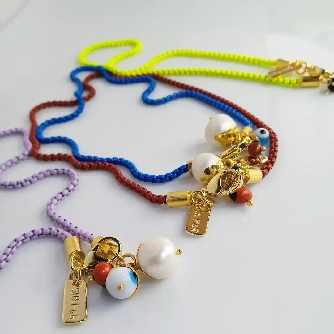 Collar casual de 42 cm de largo, con detalles en orfebrería. Dijes y trancadero con baño de Oro 24k. Disponible en varios colores la cadena