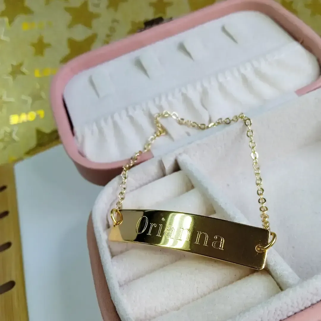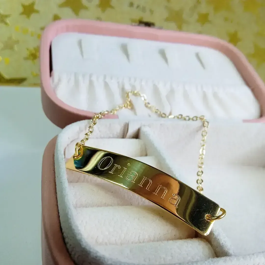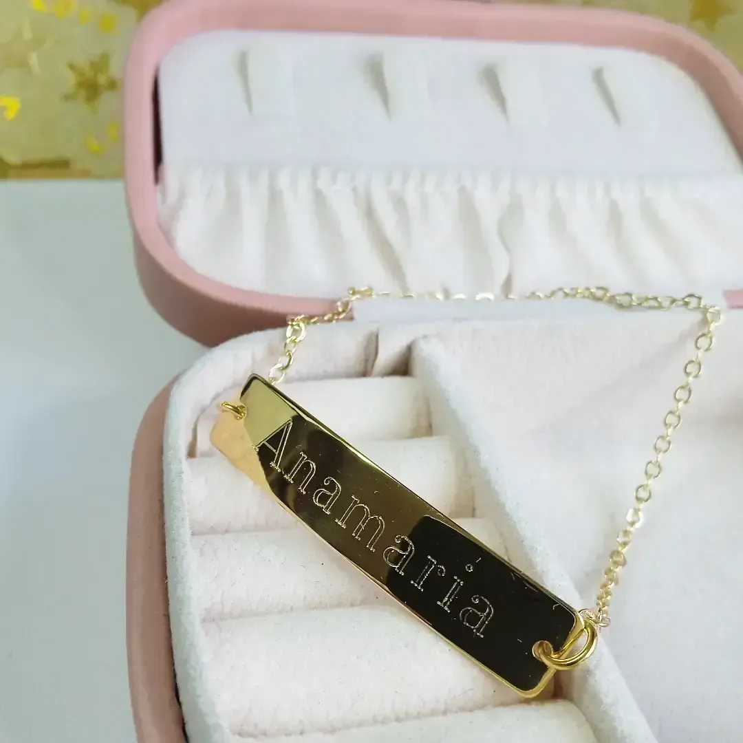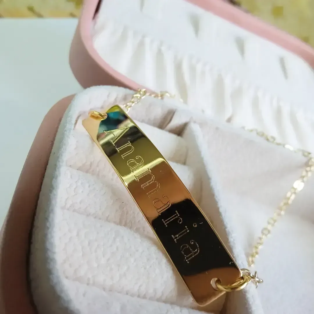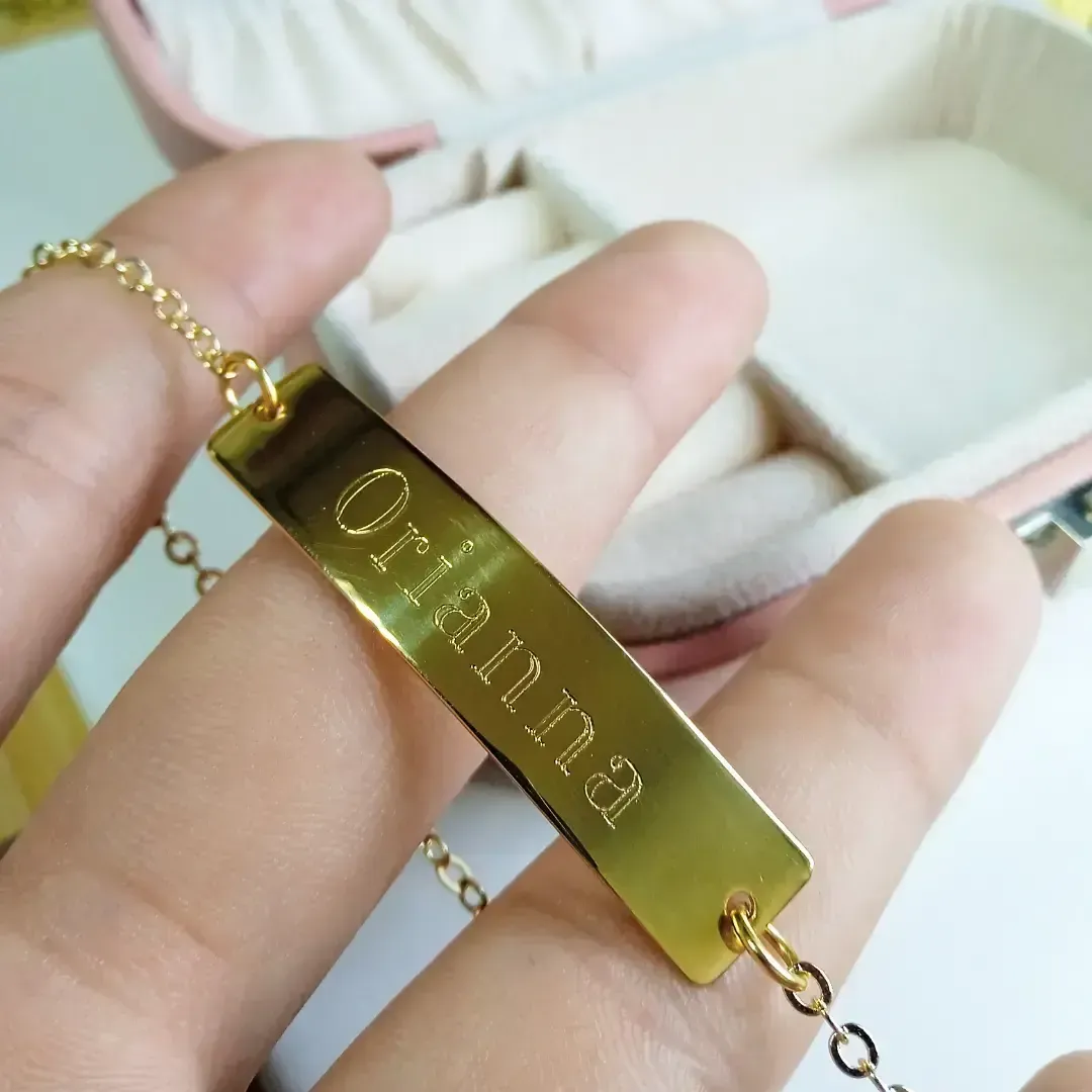 Plaquita de bronce de 0.75 mm de espesor con baño de oro 24K. Si compras la paquita el grabado de un nombre con pantógrafo te sale gratis. El precio no incluye cadena.