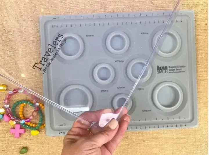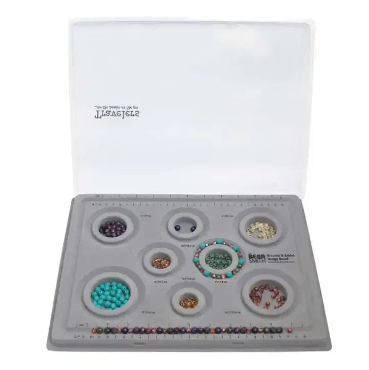 Diseño 8 canales circulares bead Smith. Dimensiones 27,3x34,9 cm. Canal recto con medidas de regla (centímetros y pulgadas). Superficie flocada para evitar que las cuentas se deslicen. Tapa transparente.